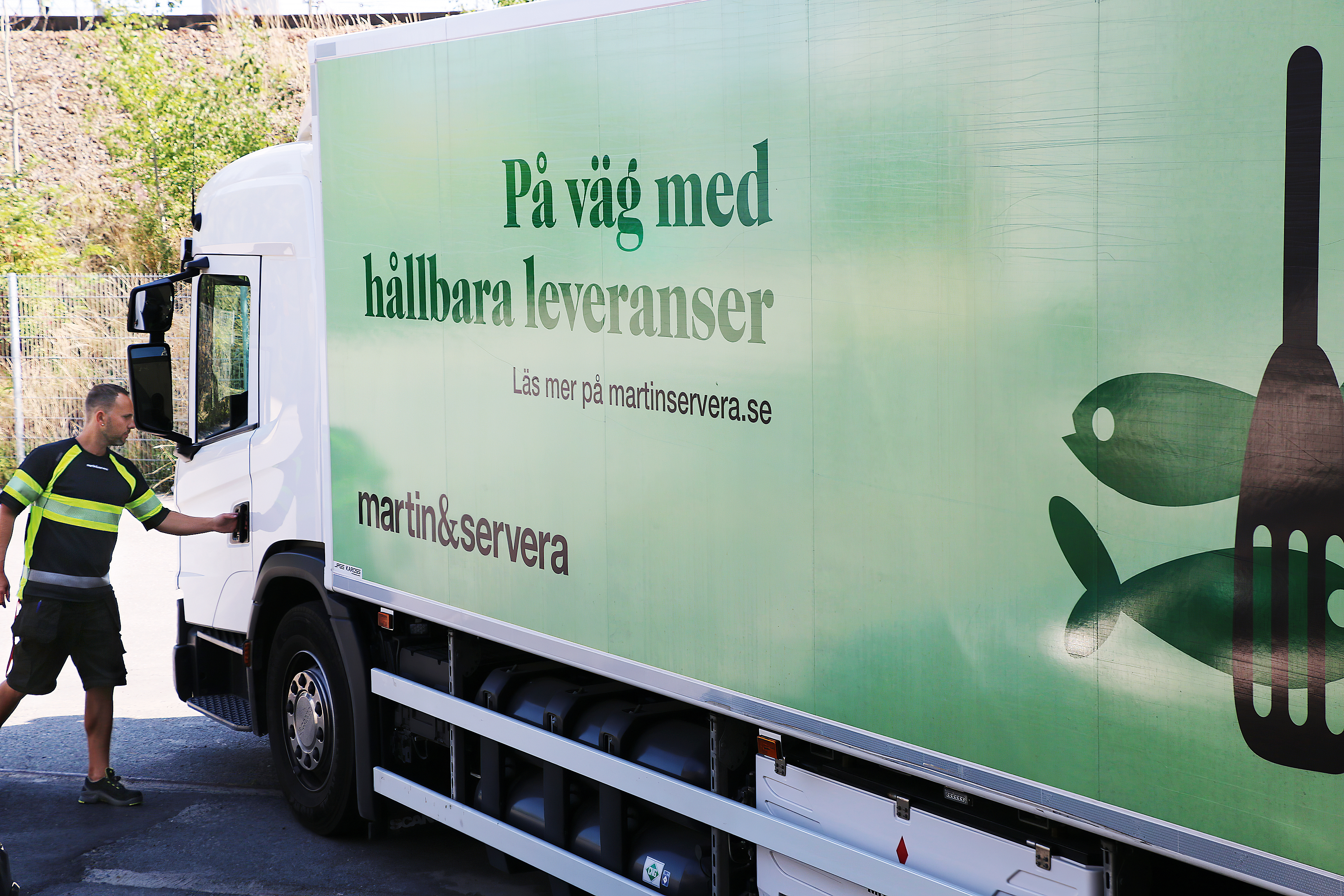 Närmare 500 lastbilar ser till att Martin & Serveras kunder får sina leveranser av mat och restaurangutrustning. Av de tunga lastbilarna körs 100 i egen regi. Sedan två år tillbaka är strategin att gå över från diesel till förnybara bränslen vid alla nyinköp.